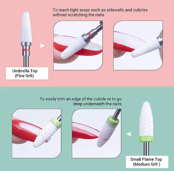 • Flame and Cone Bits for cuticle area cleaning