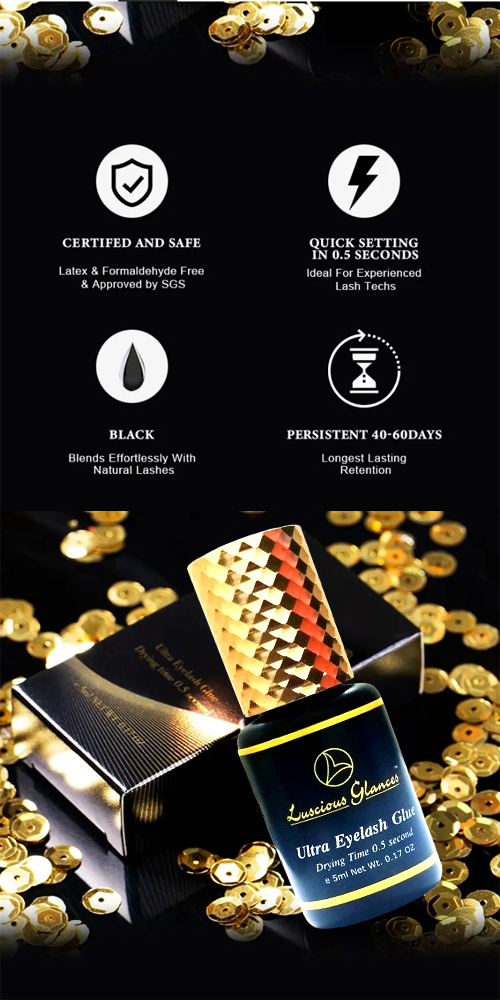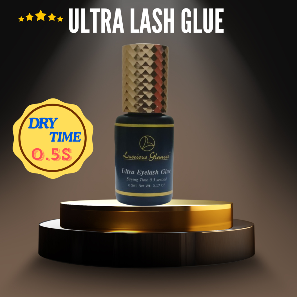 - “With a 0.5 second dry time, our Luscious Glances Ultra Eyelash Extension Glue sets the standard for quick and easy application, saving time and ensuring a long-lasting hold.”