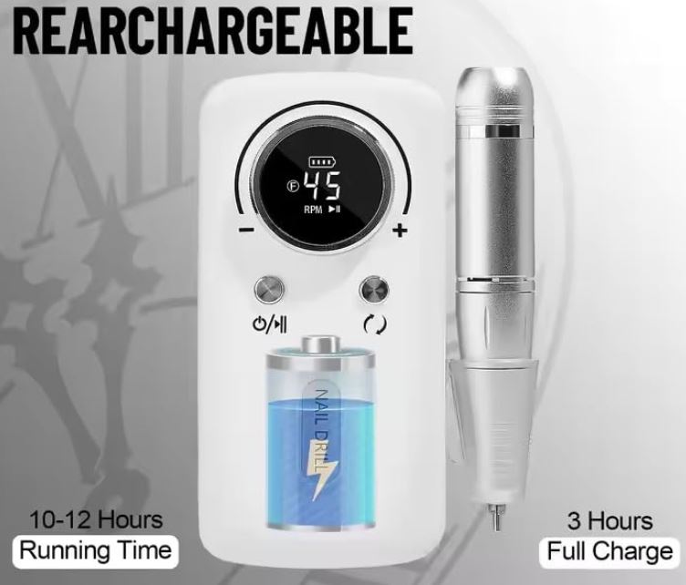 - Portable and rechargeable, this nail drill machine is perfect for on-the-go touch-ups and travel.